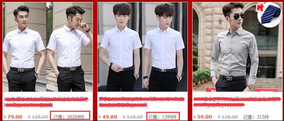 就比如这家,我随便找的(如果恰好被这家的美工或者运营看到,别打我啊,哈哈),除了第一款五分袖和最后一款的条纹衬衫,你告诉我剩下的那些款有多大区别(当然,细节上肯定会有啊)?连模特的姿势几乎都一模一样了!标题我没有截图出来,也差不多。所以他一个五皇冠的店铺,在衬衫类目下,一共72个在售单品,只有两个大爆款,其他的都是默默无闻的在那里放着。就是下面这两款: